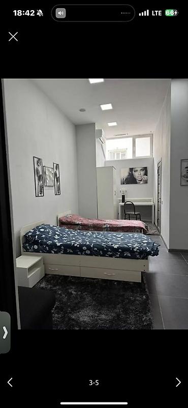 Студия с высоким потолком и двумя односпальными кроватями.