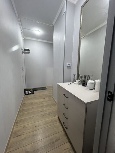 - Прихожая с большим вертикальным зеркалом в раме и комодом на 4 выдвижных ящика, розетки, место для обуви.