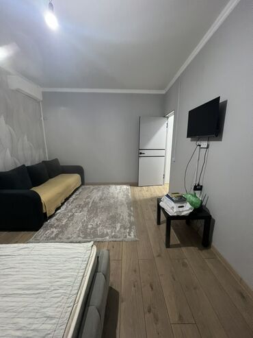 Студия/комната современного формата с мебелью и техникой.