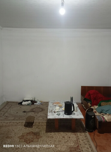 - Мебель: односпальная кровать, низкий журнальный стол, табурет/пуф