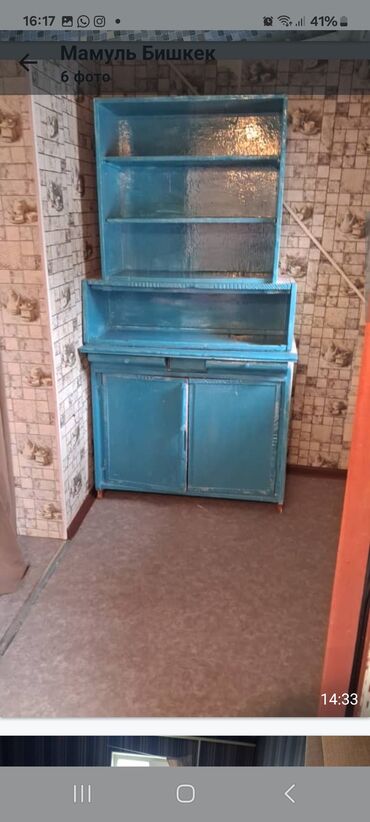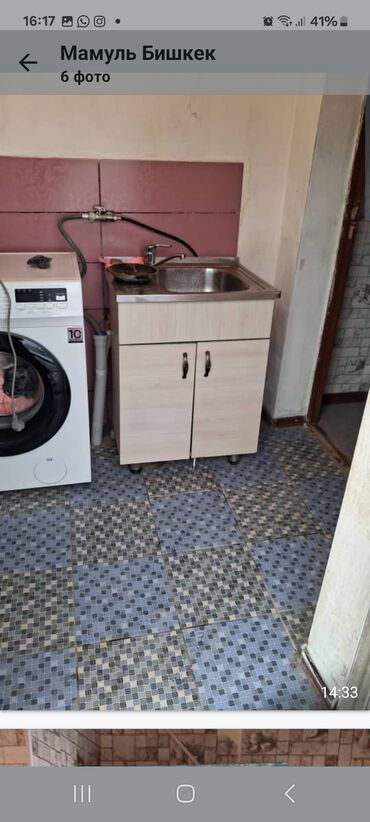 - Кухонная зона (отдельно): мойка с тумбой, стиральная машина-автомат, напольная и настенная плитка; имеется старый кухонный буфет.