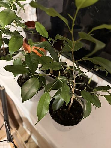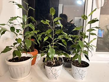- Фикус Бенджамина — молодые деревца в декоративных горшках.