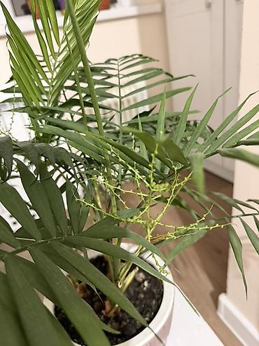 - Хамедорея (Chamaedorea, комнатная пальма) — цветёт.