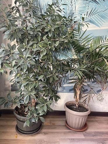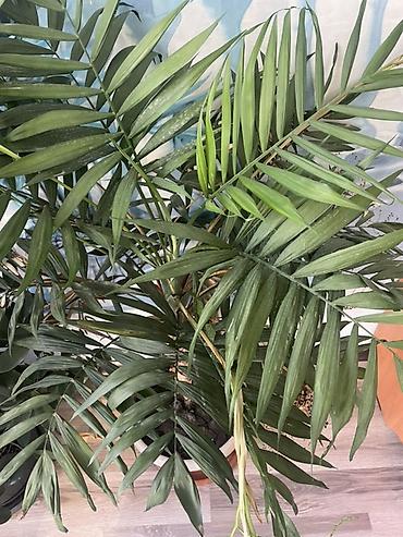 - Пальма в отдельном крупном горшке с поддоном. Перистые длинные листья, формирует несколько стеблей. Эффектно смотрится в интерьере, создаёт тропический акцент.