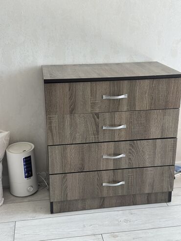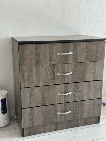 Комод в идеальным состоянии с четырьмя выдвижными ящиками, выполненный в цвете под дерево.