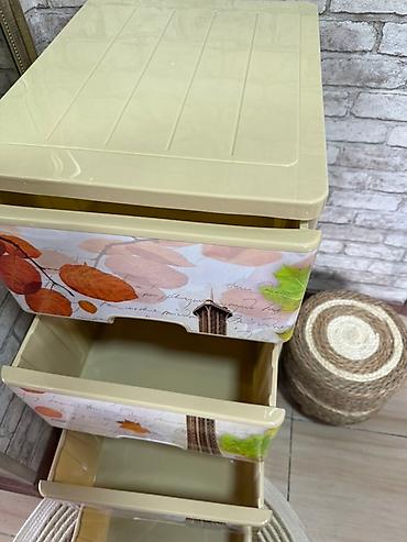 Пластиковый комод бежевого цвета с тремя выдвижными ящиками, украшенными осенним орнаментом и изображением Эйфелевой башни.