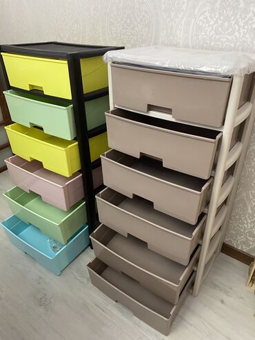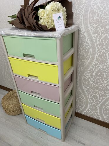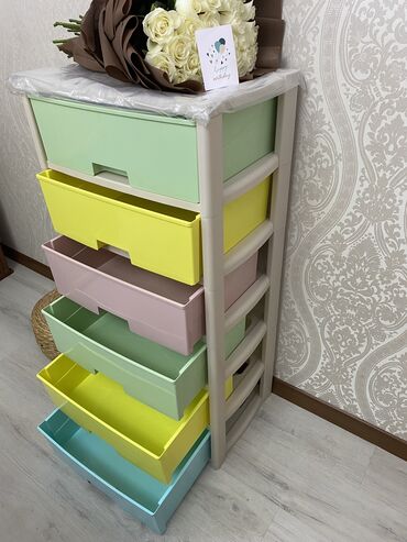 Пластиковый комод с пятью выдвижными ящиками белого цвета и салатовым каркасом, идеально подходящий для организации пространства в детской комнате, ванной, кладовой или на балконе. Верхняя поверхн...