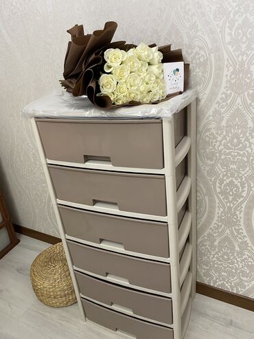 Пластиковый комод с пятью выдвижными ящиками белого цвета и салатовым