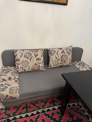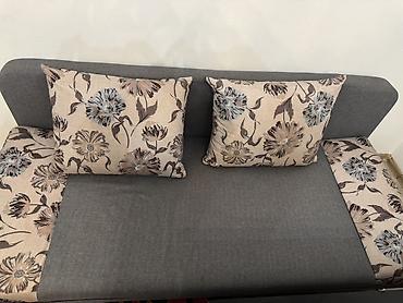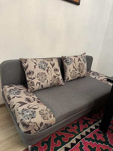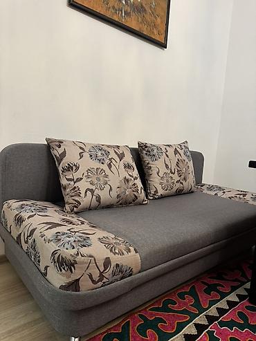 - Цвет: графитовый серый с контрастными вставками и подушками бежевого оттенка с крупным цветочным принтом.