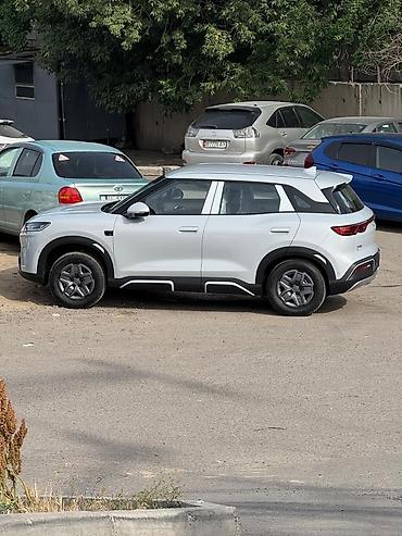 Компактный кроссовер, 5‑дверный, кузов белого цвета с контрастными черными элементами экстерьера. Современный дизайн: выразительная линия остекления, короткие свесы, рейлинги на крыше, антикрыло над задним стеклом.