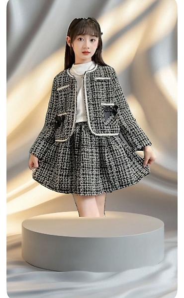 Детский костюм из твида: жакет + юбка - Стиль: классический твид в черно-белую клетку, «школьный/Chanel»-стайл. - Комплект: укороченный жакет на пуговицах и расклешенная юбка. - Декор: контрастная...