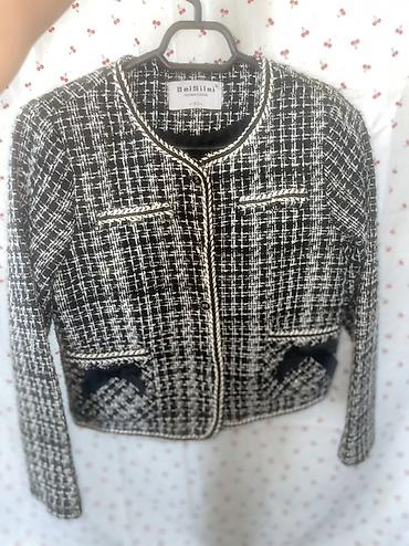 - Стиль: классический «шанель» в чёрно‑белую клетку (букле/твид).