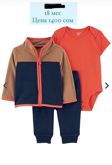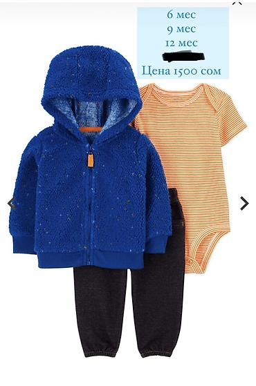 - 6 мес, 9 мес, 12 мес. Ярко-синяя флисовая куртка с капюшоном, оранжевое полосатое боди, тёмные брюки. Цена 1500 сом.