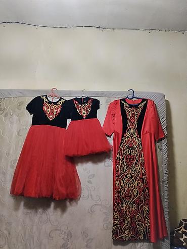 - Детские платья (2 шт.): верх из чёрной ткани с таким же орнаментом на груди; пышные многоярусные красные юбки из фатина/сетки, короткие рукава. Размеры ориентировочно для девочек разного возраста (одно больше, другое меньше).