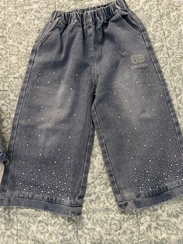 - Джинсовые брюки в тон: прямой крой, эластичный пояс, декор стразами спереди, небольшая нашивка «BB DINOSHIN».