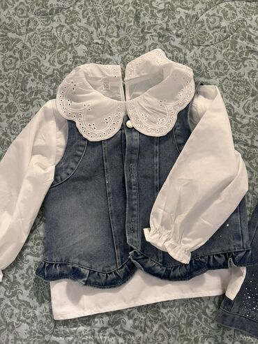 - Джинсовый жилет поверх: мягкий деним серо‑синего цвета, фигурный низ с оборкой.