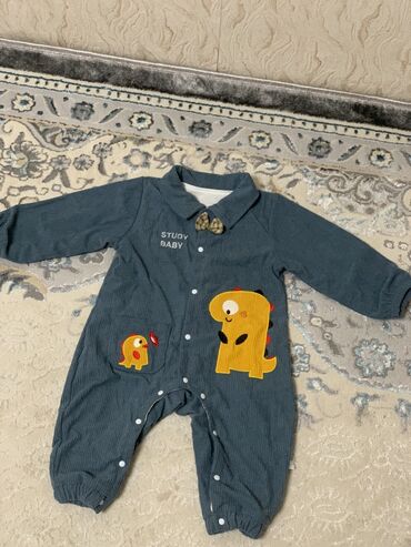 - Велюровый/кордовый слип-человечек тёмно‑синего цвета с воротничком, кнопками по переду и забавными нашивками динозавров, надпись STUDY BABY.