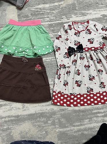 Отдам даром Комплект детской одежды для девочки. Состав набора: - Джинсовое платье-рубашка темно-серого цвета с принтом в горошек и маленькими бантиками. Воротник-стойка, длинные рукава, централь...