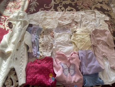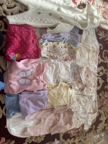 Большой набор одежды для новорождённого/малыша (примерно 0–6 мес). В комплекте: - Распашонки, кофточки, бодики, ползунки и штанишки с закрытыми ножками и без — разные расцветки и принты. - Комбине...