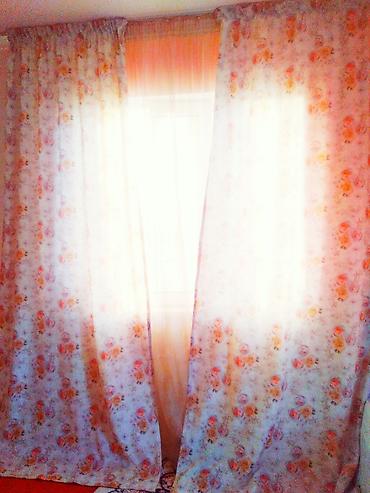- Портьеры с тюлем: нежный полупрозрачный тюль персикового оттенка и плотные шторы с цветочным принтом в пастельной гамме. Верх — на шторной ленте/резинке для карниза, классическое распахивание по центру.