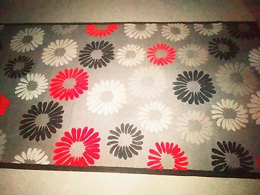 - Коврик с ромашками: тонкий ковёр на сером фоне, крупные цветы в белом, чёрном и красном цветах, прямоугольный.