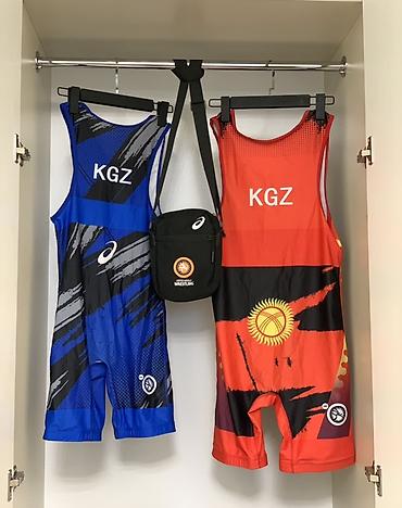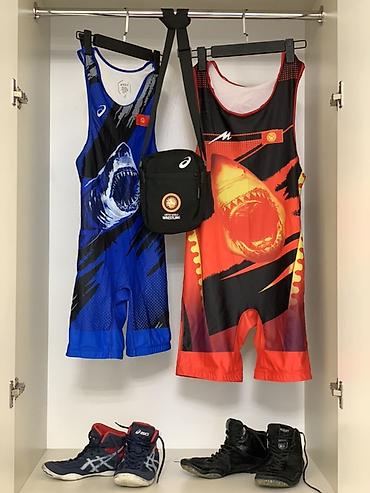 - Два борцовских трико Asics с принтом «акула» и маркировкой KGZ (синий и красный варианты). Эластичный дышащий материал, длинная штанина, нанесены эмблемы United World Wrestling.
