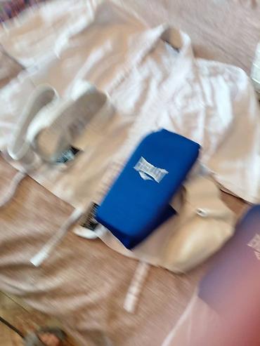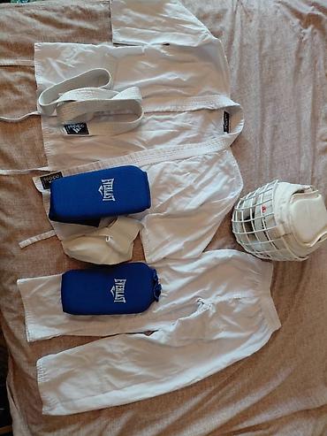 Бренды: Adidas (кимоно, пояс), Everlast (щитки). Цвета: белый (кимоно, шлем, пояс, защита паха), синий (щитки). Размеры и маркировки видны на фото ярлыков. Идеальный набор для тренировок и аттестаций начинающего спортсмена.