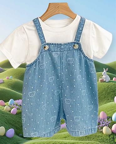- Комбинезон-шорты из светло-голубого денима с регулируемыми бретелями ,