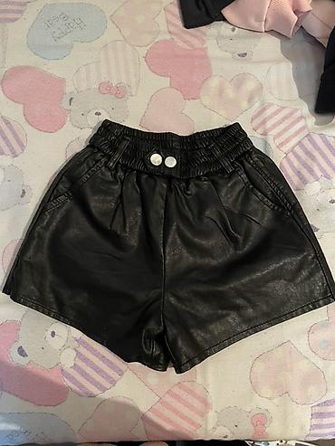 - Шорты из эко-кожи черные: высокая посадка, сборка на поясе с эластичной резинкой, два белых декоративных пуговица спереди, боковые карманы.