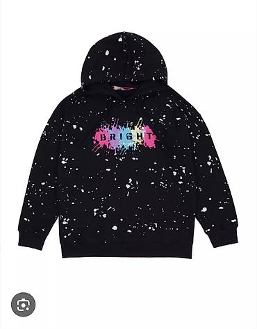 4) Черный худи с капюшоном: эффект «космических брызг», цветной принт на груди.