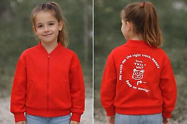 2) Ярко‑красный: без принта спереди; на спине круговой белый принт с забавным персонажем и фразами “THIS WAY”, “keep on moving!”.