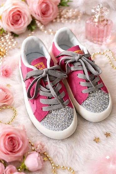 - Цвет: малиново‑розовый верх, серебристый глиттер на мысках, серые шнурки, белая подошва