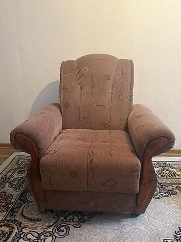 Представляем комплект мягкой мебели, состоящий из кресла и дивана, выполненных в едином стиле. Состояние б/у .Оба предмета обиты тканью светло-коричневого или бежевого оттенка с узорчатым принтом, включающим геометрические фигуры и завитки. Подлокотники имеют декоративные деревянные элементы, придающие классический вид. Мебель оснащена мягкими спинками и сиденьями, обеспечивающими комфорт.