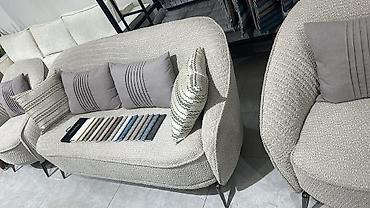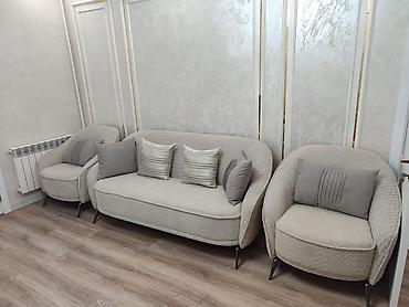 Комплект мягкой мебели в современном стиле: двухместный диван и два кресла.