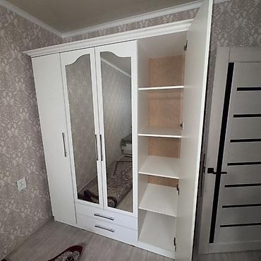 Предлагается комплект мебели для спальни, включающий шкаф, комод с зеркалом и каркас кровати. Шкаф имеет двухстворчатую конструкцию с одной секцией для вешалок и выдвижными ящиками внизу, а также в...
