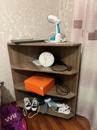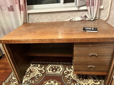 - Письменный стол из массива/ЛДСП в тёплом древесном тоне: широкая столешница, тумба с двумя глубокими выдвижными ящиками, ниша под системный блок/хранение и полка под клавиатуру или канцелярию.