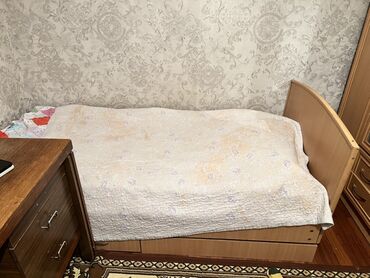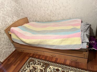 - Односпальная кровать с высоким изголовьем и изножьем, стандартный матрас 90×200 см (по фото). Под спальным местом — три выдвижных ящика на всю длину кровати для хранения белья и вещей.
