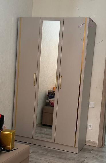 - Цвет — светло‑бежевый/капучино с вертикальными золотистыми вставками и ручками