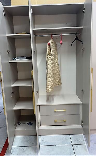 - Внутри: слева секция с полками; справа/в центре — отделение с поперечной штангой для вешалок и верхней полкой