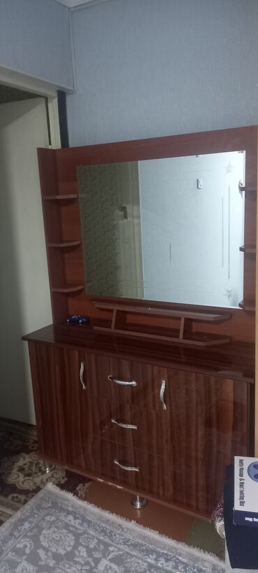 - Комод с зеркалом (туалетный стол): фасады под древесную текстуру, три выдвижных ящика по центру и по одной дверце по бокам, большое зеркало с декоративными полками по краям и небольшой полкой под зеркалом. Металлическая фурнитура, опоры-ножки.
