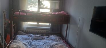 - Двухъярусная кровать: верхний ярус — односпальный, нижний — широкий (формат полуторный/двуспальный). Деревянная конструкция, защитные бортики на верхнем ярусе, лестница сбоку.