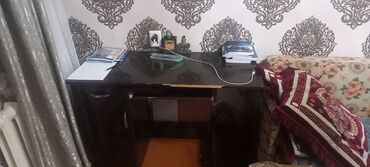 - Письменный стол: темная глянцевая столешница, слева тумба с дверцей, по центру ниша под клавиатуру/аксессуары, справа открытое пространство для ног.