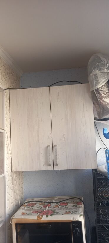 - Настенный кухонный шкаф: двухдверный, светлое дерево с текстурой, металлические ручки. Компактный навесной модуль для кухни/кладовой.