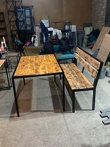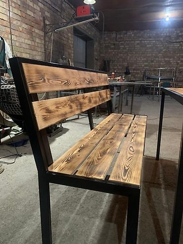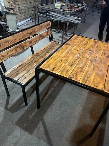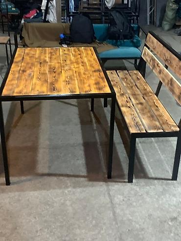 Комплект мебели, состоящий из стола и скамьи с спинкой. Изделия выполнены из дерева с эффектом обжига и металла, окрашенного в черный цвет. Стол имеет прямоугольную столешницу, а скамья подойдет для комфортного размещения нескольких человек. Прочная и стильная мебель для дома, дачи или кафе.