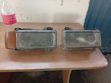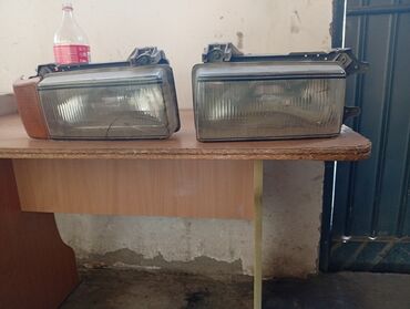 Пара передних фар для автомобиля (левый и правый блок). Прямоугольная оптика с ребристым стеклом, в сборе с корпусами и креплениями. На левой фаре установлен боковой указатель поворота/габарит с оранжевым рассеивателем. Разъёмы и посадочные места под стандартные лампы; металлические/пластиковые кронштейны крепления на корпусе.