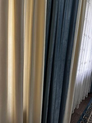 - Портьеры из мягкой матовой ткани с бархатистым эффектом, два цвета: теплый сливочный и глубокий графитово‑синий. Хорошо драпируются, держат складку, подходят для затемнения комнаты и зонирования света.