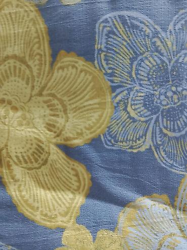 - Яркие принты: крупные цветы на серо-синем фоне, геометрический узор в пастельных тонах, жёлтый фон с разноцветными цветами.