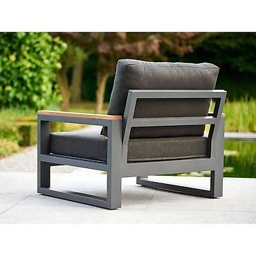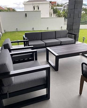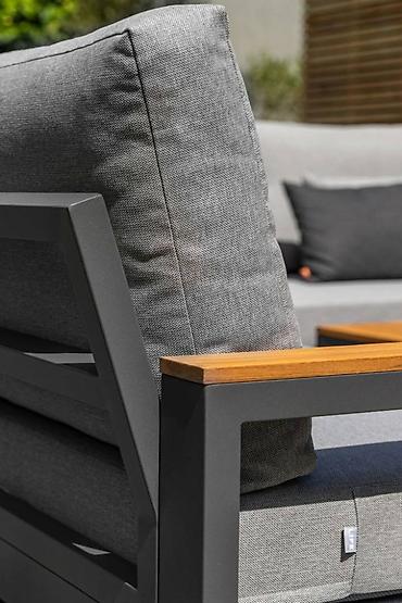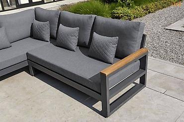 Уличный модульный комплект мебели для террасы/патио Состав: - Угловой диван L-образной формы с интегрированными боковыми деревянными площадками-полками. - Отдельное кресло в том же стиле. - Оттома...