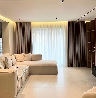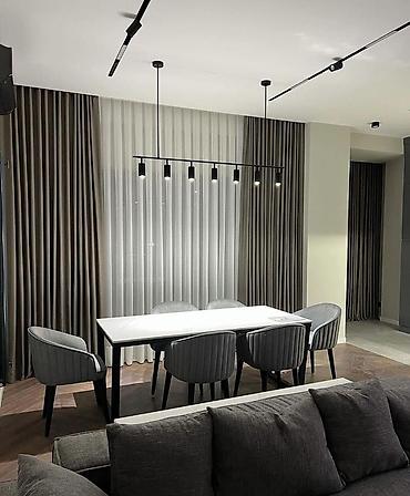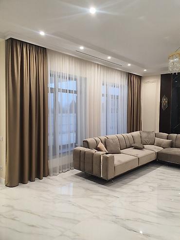 - Посадка: потолочный монтаж на скрытую нишу или трек/карниз; равномерные глубокие складки по всей высоте.