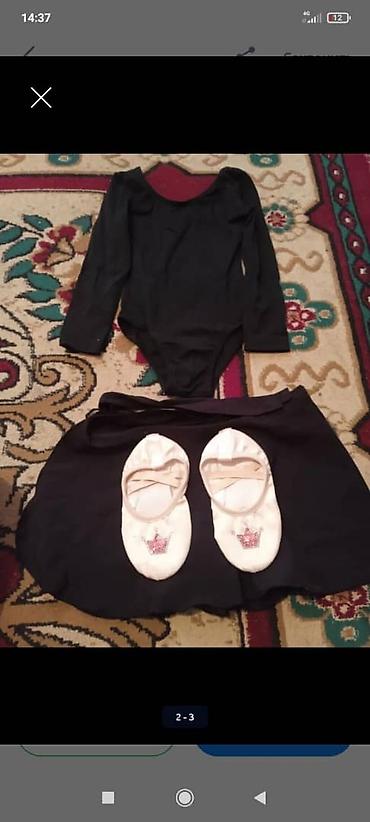 Комплект для занятий хореографией/балетом для девочки. В составе: - Черный купальник с длинным рукавом и круглым вырезом. - Черная шифоновая юбка на завязках. - Белые балетки-чешки с перекрестными...